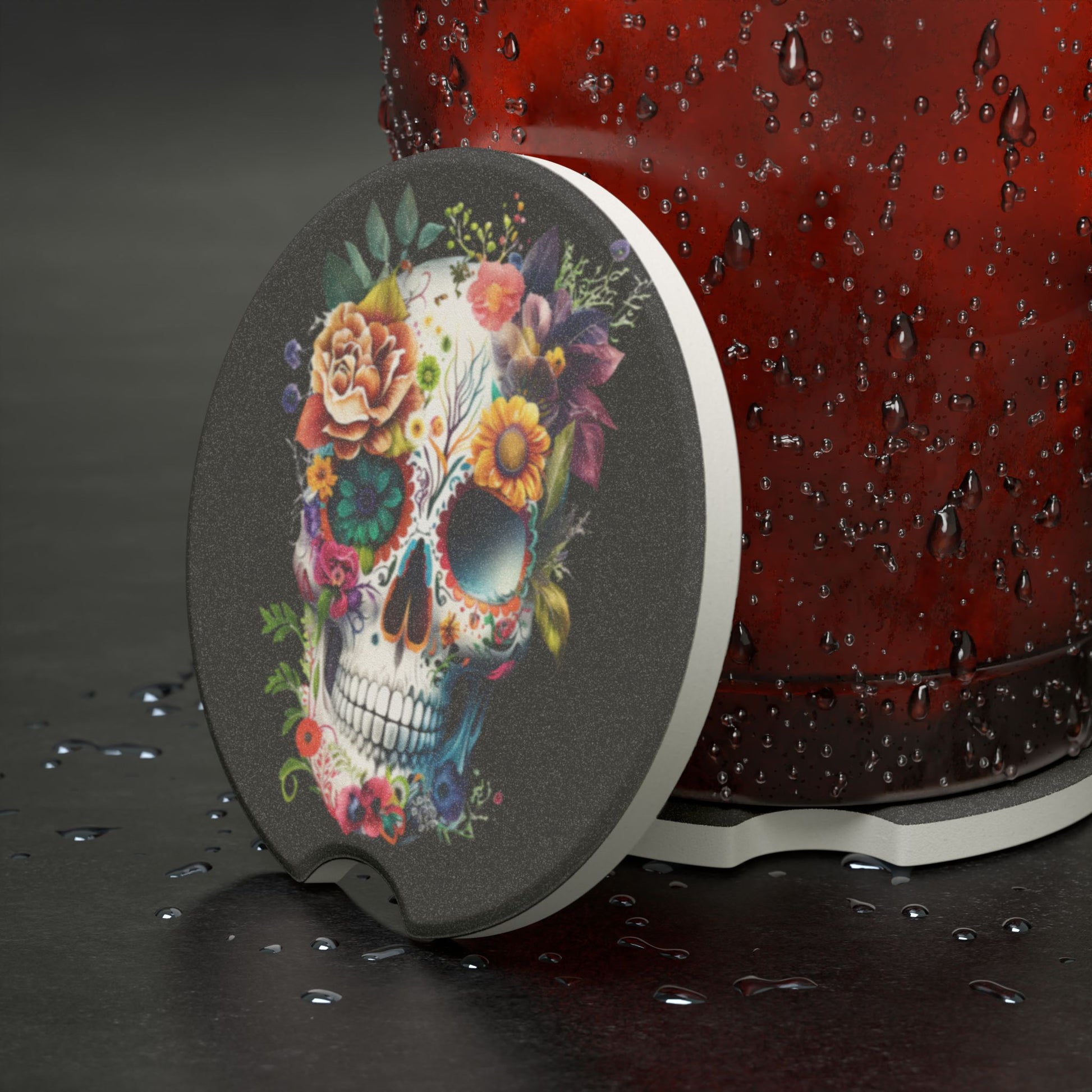 Skull Floral Soapstone Car Coaster, Artistic Auto Accessories, Unique Gifts for Car Lovers, Car Decor, Day of the Dead Decor